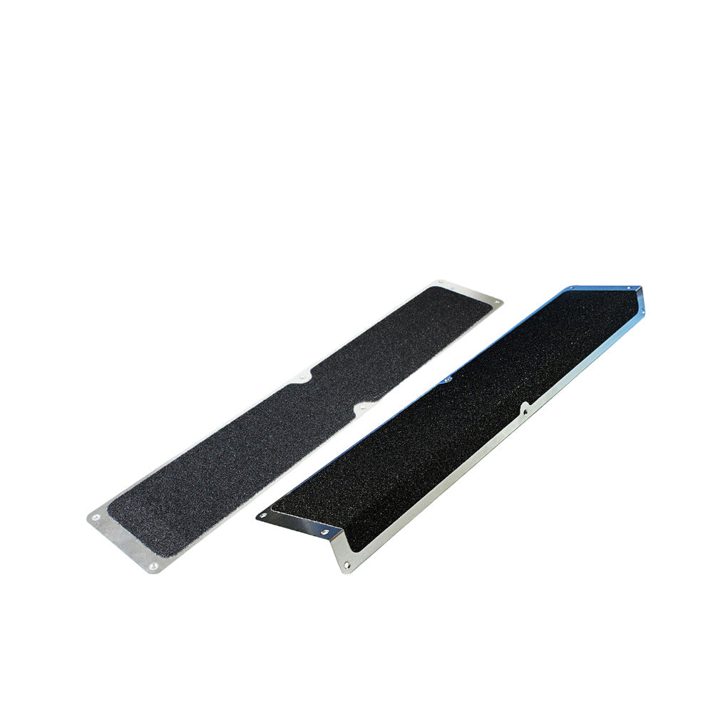 Våre plater er laget av værbestandig aluminium som ikke vil anløpe i dårlig vær, med et sklisikkert belegg som dekker det meste av den øvre overflaten og avsluttes med avrundede hjørner for et mer estetisk utseende. Vi lagerfører våre sklisikre bolt-down plater i fire størrelser: