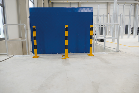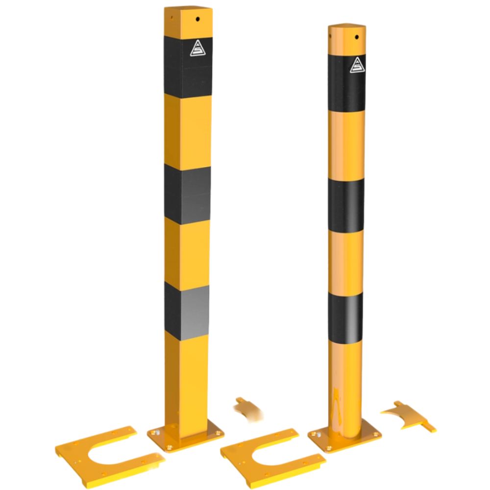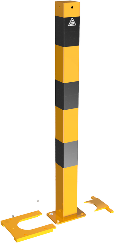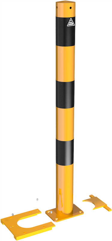 Denne gule stolpen med svarte striper markerer fareområder og begrenser områder du vil holde fri for trafikk. Stolpen er festet til den faste bunnplaten fra forsiden ved hjelp av et T-formet stykke. Den kan imidlertid enkelt byttes ut om nødvendig, ettersom det kun er bunnplaten som er permanent festet til bakken, ikke selve stolpen.