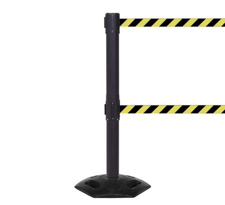 Outdoor Twin er en robust, bærbar barriere som er ideell for å lage utendørs køer eller begrense tilgang til midlertidige arbeidsområder. Det nedre beltet hindrer fotgjengere fra å dukke under beltet og gir veiledning for synshemmede som bruker stokk.