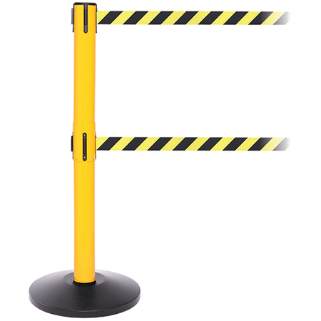 Flexibarrier SafetyPlus Double 3,4m er en beltebarriere med 2 uttrekkbare 3,4 meter belter. Den integrerte uttrekkbare beltemekanismen inneholder en fjær som sørger for at beltet alltid er under spenning, selv om beltet ikke er rullet helt ut.