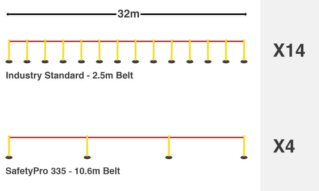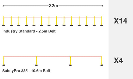 Flexibarrier SafetyPlus 10m er en beltebarriere med et ekstremt langt 10,6 meter (!) uttrekkbart belte. Den integrerte uttrekkbare beltemekanismen inneholder en fjær som sørger for at beltet alltid er under spenning, selv om beltet ikke er rullet helt ut. SafetyPlus kommer med en knapp på mekanismen som kan brukes til å låse beltet.
