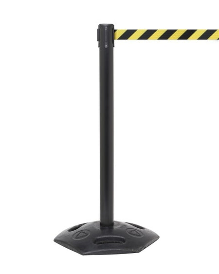 Stålbarrierestolpe utstyrt med et innebygd, ekstra langt, uttrekkbart barrierbånd på 4,9 meter.