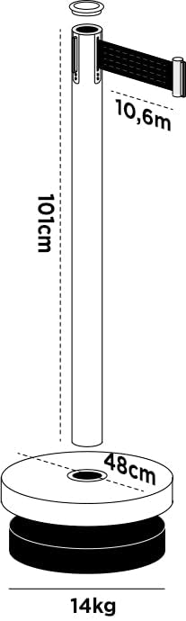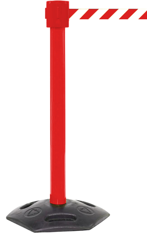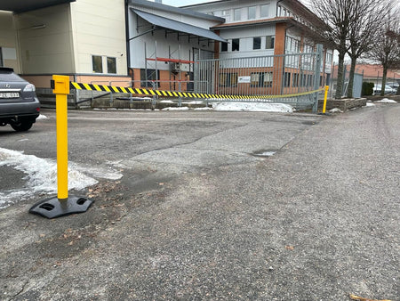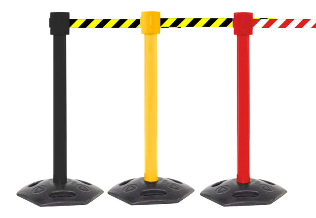 FlexiBarrier Outdoor 1050 står på en slitesterk gummibase med et håndtak som gjør det enkelt å flytte rundt. Hver stolpe er som standard utstyrt med en mottaker som gjør det mulig å feste et innkommende belte fra alle retninger.