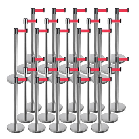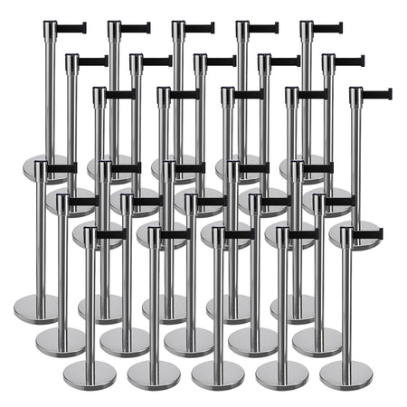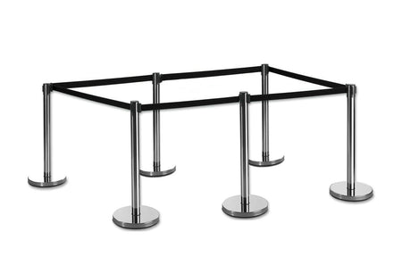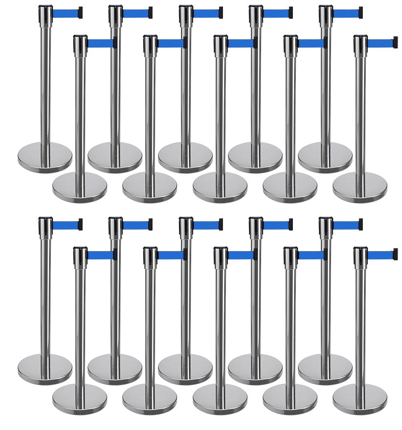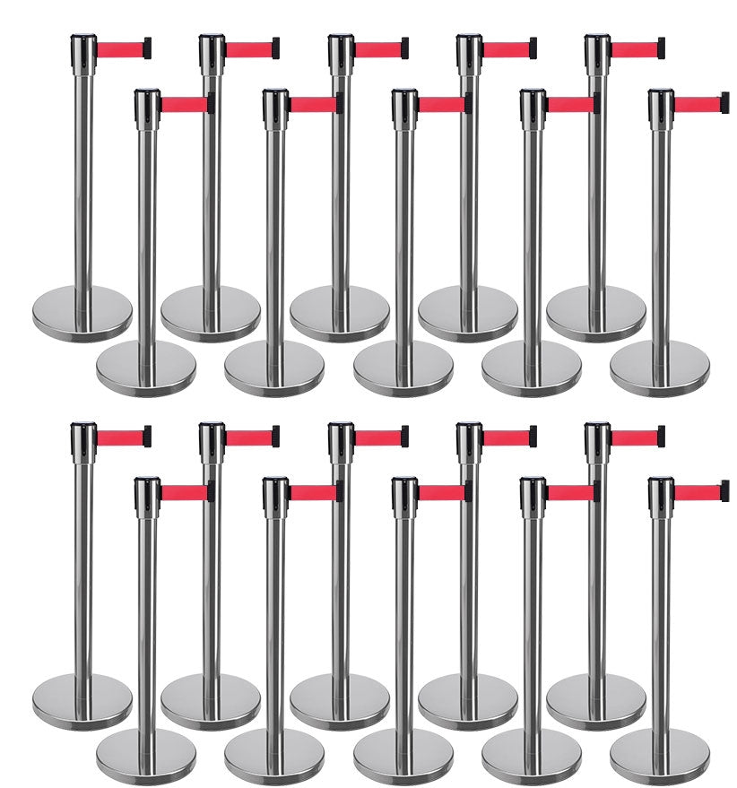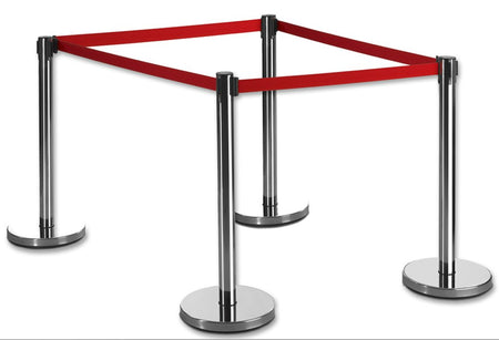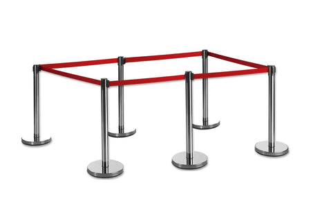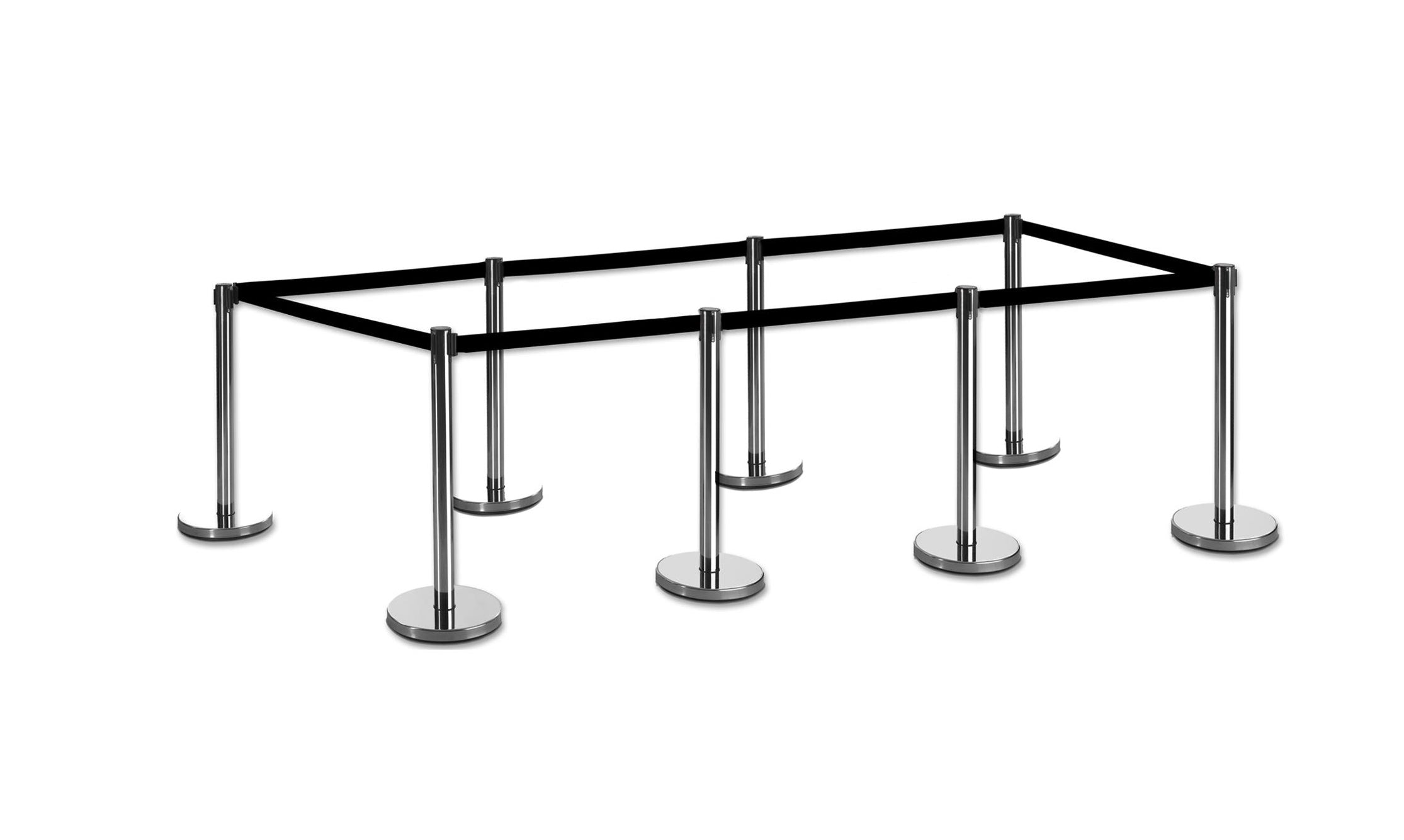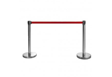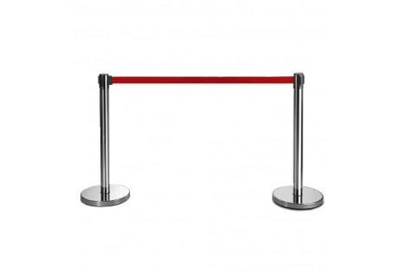 Pakke med FlexiBarrier beltestolper -Eco- i sølv. Hver stolpe inkluderer et innebygd 2 meter uttrekkbart belte.