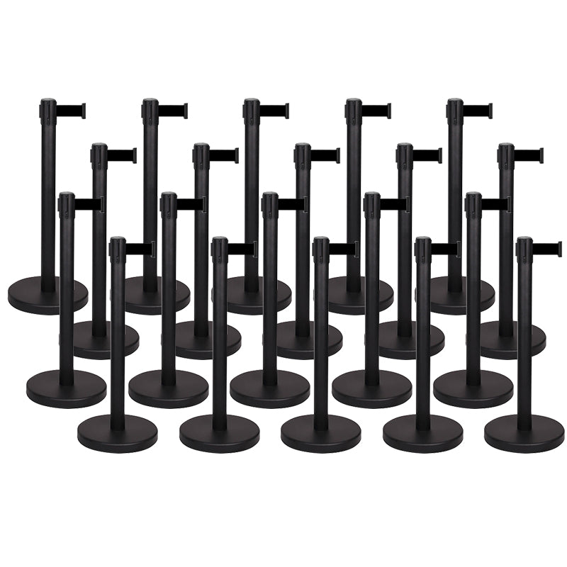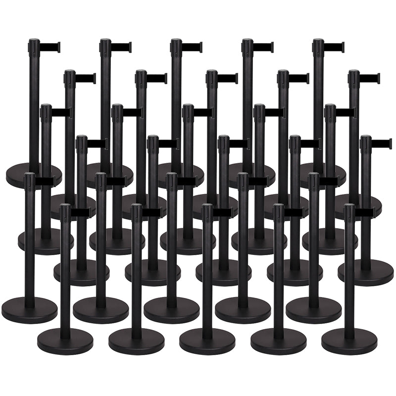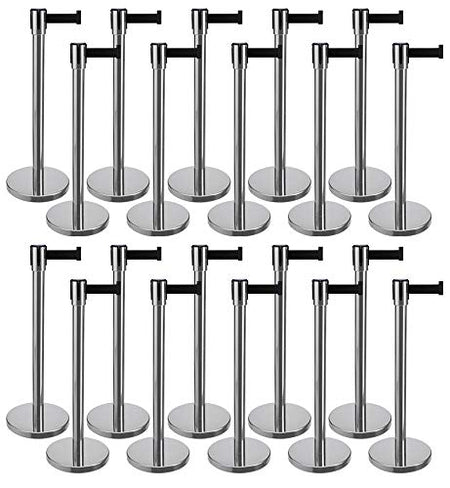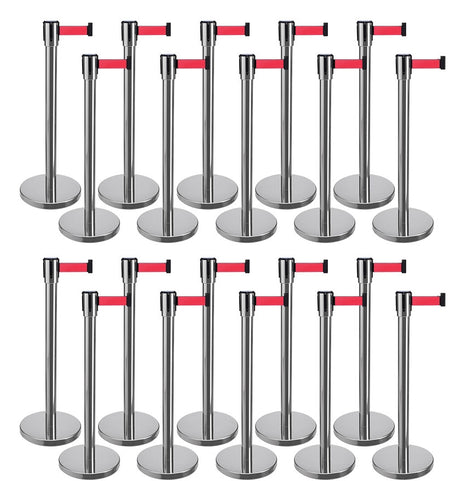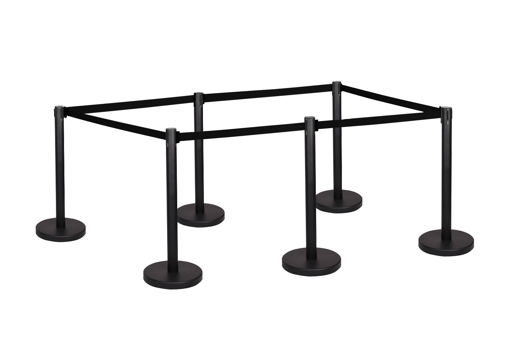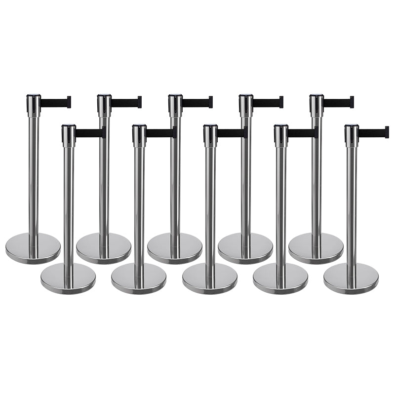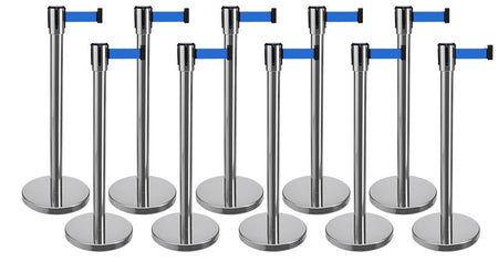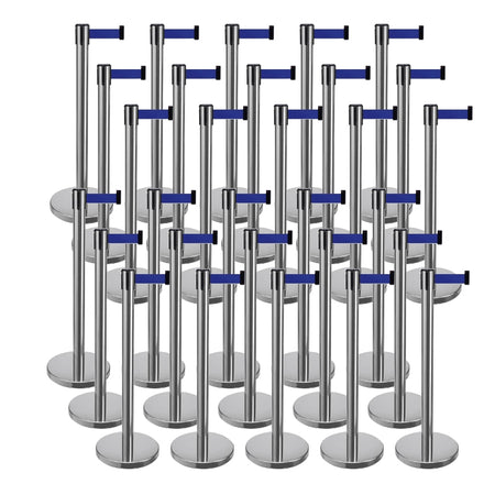 Pakke med FlexiBarrier beltestolper -Eco- i sølv. Hver stolpe inkluderer et innebygd 2 meter uttrekkbart belte.