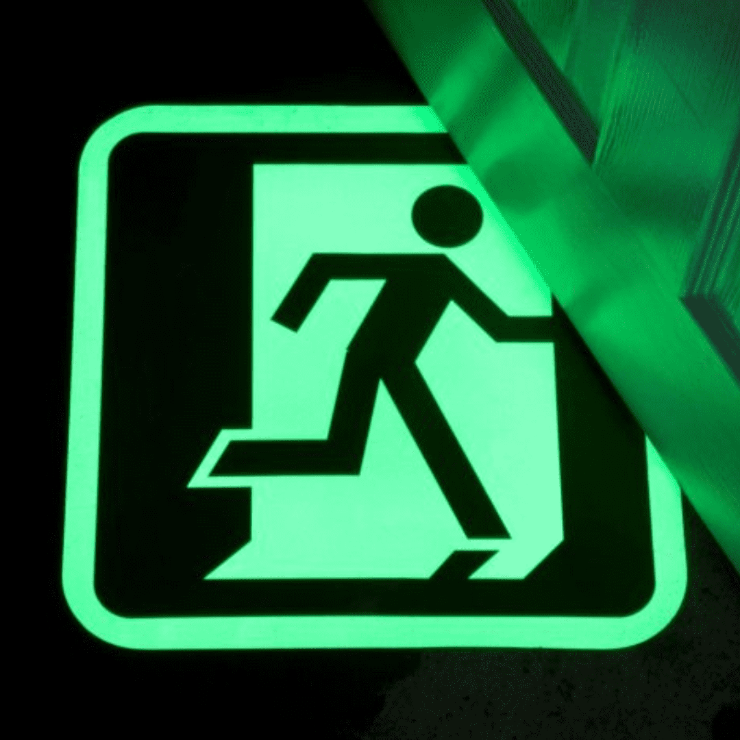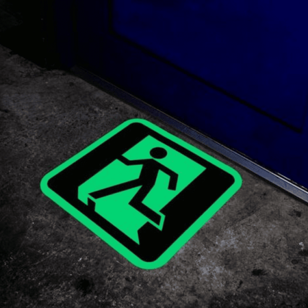 Selvlysende Gulvskilt er høy-synlige, selvklebende fotoluminescerende skilt designet for å tydelig markere nødutganger og rømningsveier både i opplyste og mørklagte forhold.