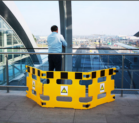 HandiGard er et modulært sperresystem av høy kvalitet som leveres i sett med 2, 3 og 4 paneler. Konstruert av slitesterk polyetylen, er denne lette sikkerhetsbarrieren ideell for både innendørs og utendørs bruk for midlertidig å hindre fotgjengeradgang til farlige områder. Hvert panel leveres som standard med permanent støpt grafikk med advarselssymbol og gule/svarte reflekterende striper. Den glatte paneloverflaten gjør rengjøring enkelt. Flere sikkerhetspaneler kan kobles sammen ved hjelp av snap-on hengsler som følger med. Sammenkoblede modulære paneler hjelper til med å lage barrierer av enhver størrelse rundt farer. Den har et praktisk sammenleggbart design for enkel manøvrering og lagring når den ikke er i bruk. Hvert panelstørrelse: 800mm (H) x 1000mm (B) x 30mm (D).