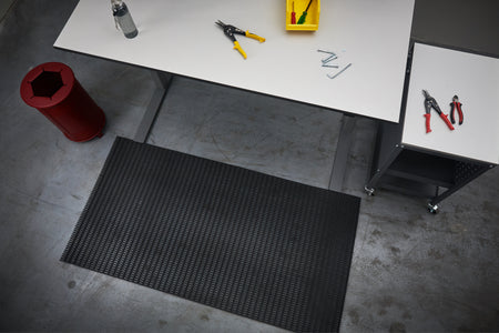 Matten er konstruert av sveisede vinylprofiler som gir en dempende, tretthetsreduserende effekt for ben og rygg, noe som gjør den egnet for lange perioder med stående arbeid i industrielle arbeidsplasser.