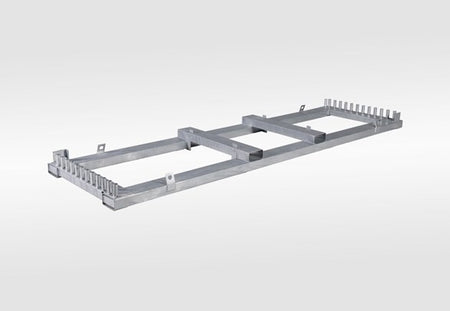 Tungtransportpall laget av galvanisert stål, designet for å holde opptil 30 midlertidige gjerdepaneler (3,5 m). Bygget for effektiv lagring, håndtering og transport av gjerdesystemer på byggeplasser eller arrangementsområder.