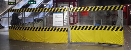 Varselsdekke med høy synlighet i gult og svart, designet for å passe standard midlertidige gjerdepaneler (2m x 3,5m). Ideell for å forbedre sikkerhet og synlighet på byggeplasser og andre avsperrede områder.